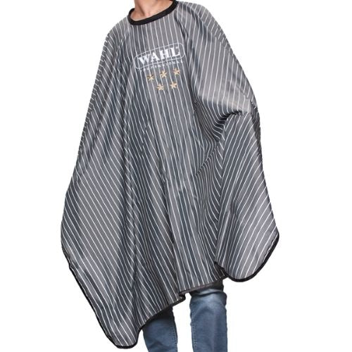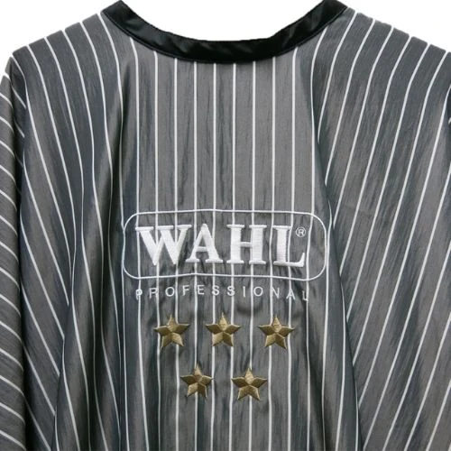 La Capa de corte Wahl diseño 5 estrellas con cierre de clip está fabricada en 100% poliéster en color gris muy resistente, con el logo bordado en color blanco y estrellas en color dorado. Es una capa extra larga tamaño XL, de 137 x 160 cm de medidas totales, para proteger al cliente con cuello ancho y cierre trasero con clip. La capa de corte Wahl está libre de energía estática y resistente al agua.