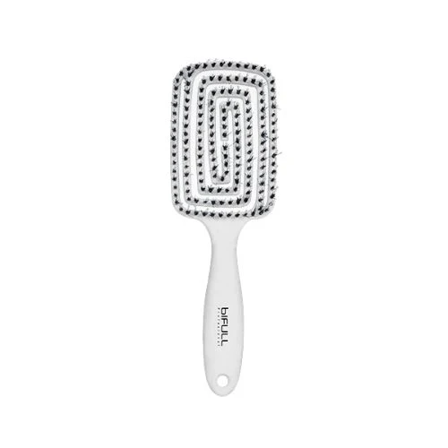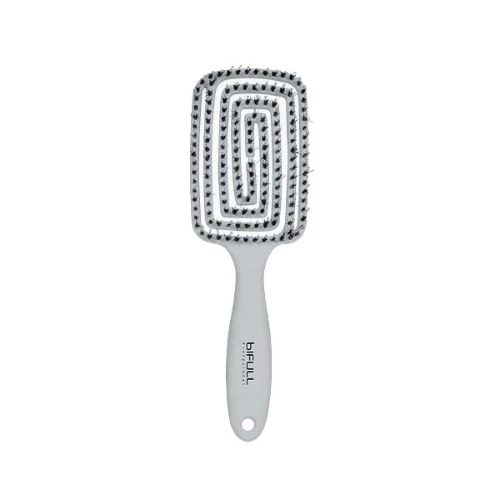 El Cepillo Esqueleto Maze Bifull en colores negro, blanco y gris. Diseño de estructura geométrica y flexible que se adapta fácilmente a la cabeza para cepillar desde la raíz a las puntas. Ideal para reducir los tirones y disfrutar del cepillado de forma suave pero efectiva. Combinación de cerdas flexibles de nylon y pelo de jabalí que aportan brillo y suavidad al cabello. Estimulan el cuero cabelludo. Se puede usar tanto en cabello seco como mojado.