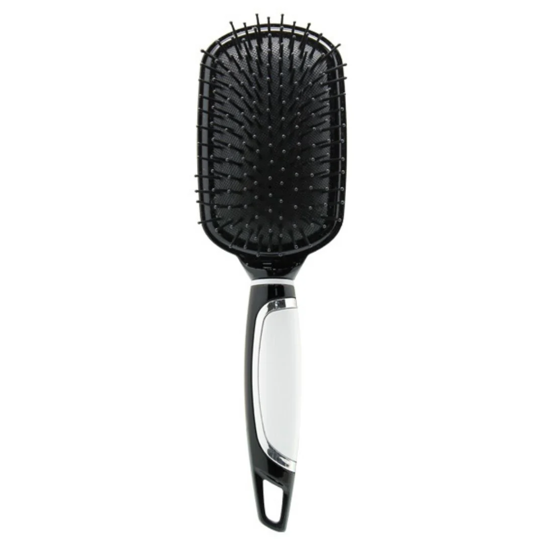 Cepillo neumático Raqueta blanco y negro de púas con bola de diseño elegante y mango ergonómico muy fácil de girarlo durante el trabajo. Fabricado con púas de plástico de color negro con bola en la punta para proteger el cuero cabelludo.