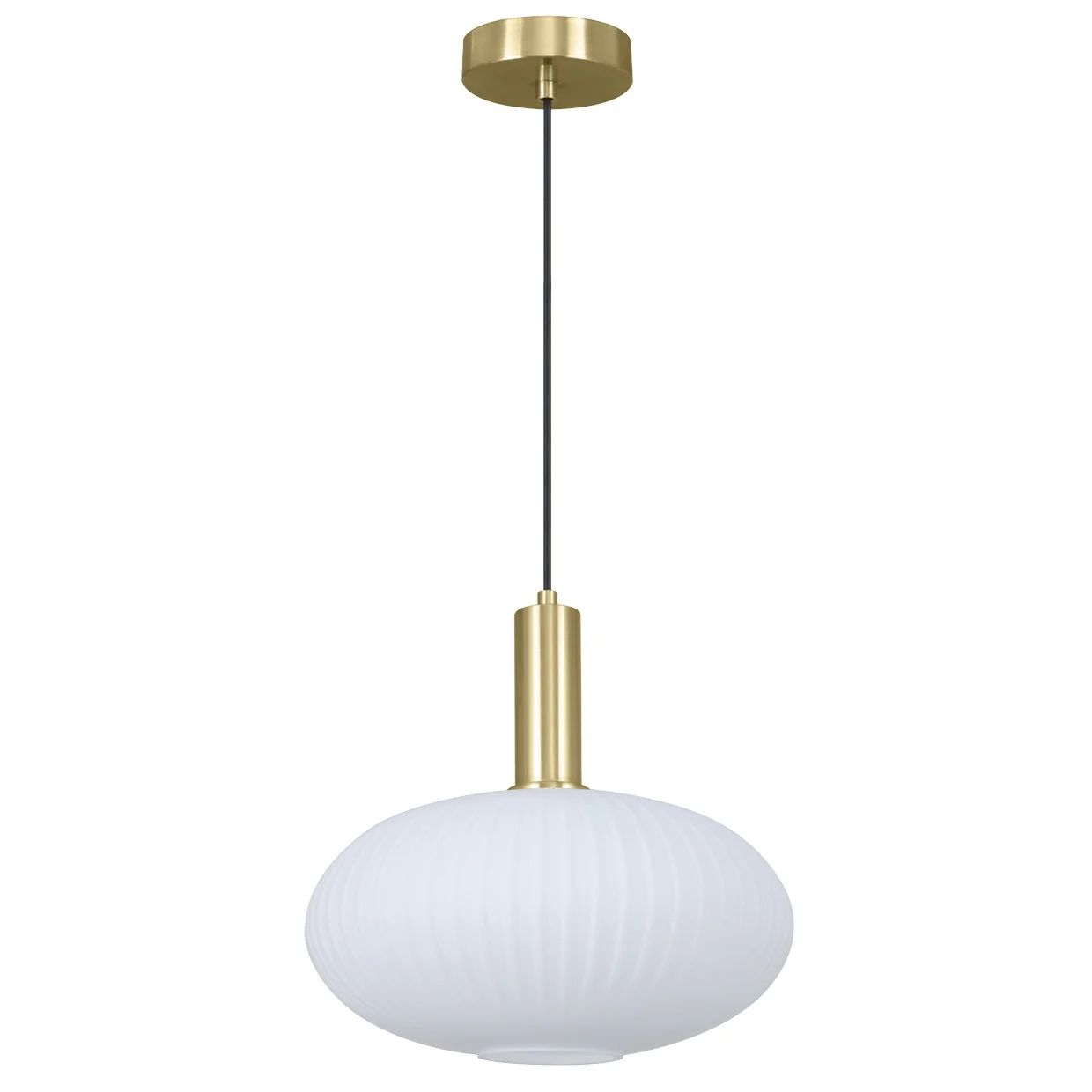 El acabado latón combinado con la tulipa opal rayada ofrece un diseño único que añade textura visual, superando a modelos básicos al proporcionar una luz más refinada y duradera para entornos cotidianos.