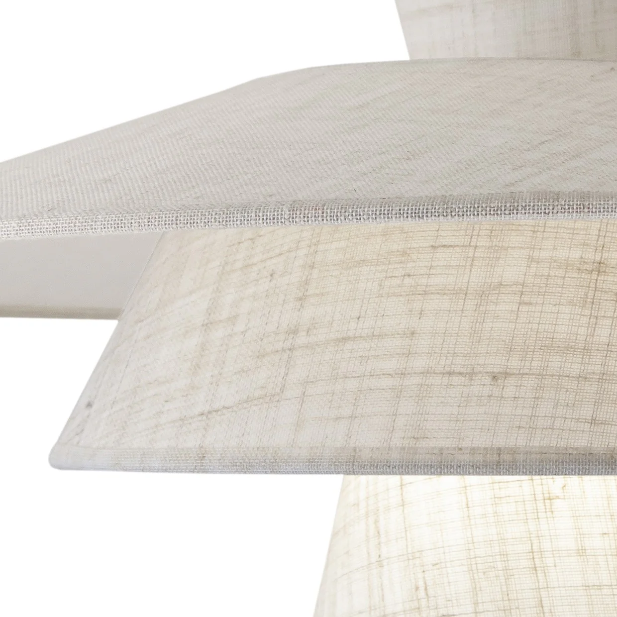 - Pantallas de tela lino tostado: Cuatro pantallas en tamaños variados (cono superior 13×8 cm y disco grande 20×50 cm) que difunden la luz suavemente, reduciendo sombras y creando un ambiente acogedor en espacios de hasta 20 m².