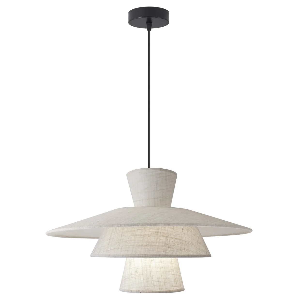 Este colgante destaca por su construcción equilibrada, que asegura durabilidad y una distribución uniforme de la luz gracias a las pantallas de tela lino tostado. El cable negro añade un toque industrial sutil, mientras que el portalámparas E-27 permite usar bombillas estándar de hasta 60W, optimizando el consumo energético sin sacrificar brillo.