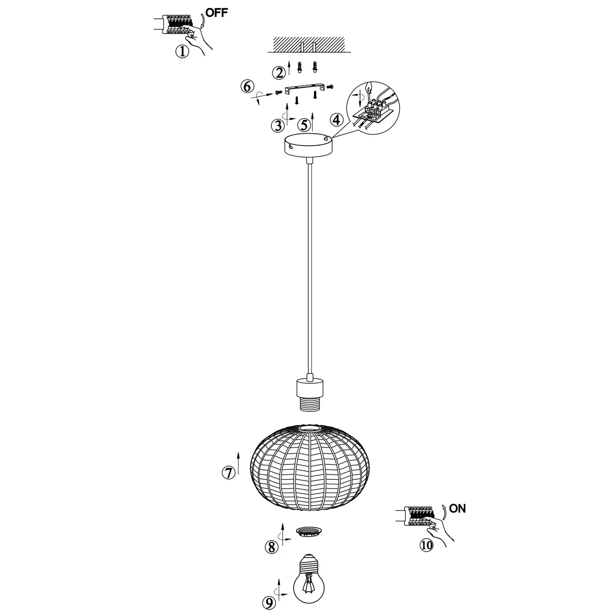 La instalación es sencilla con un gancho estándar en el techo; su cable de 150 cm permite ajustes de altura. Recomendamos un electricista para conexiones seguras, compatible con la mayoría de instalaciones domésticas.