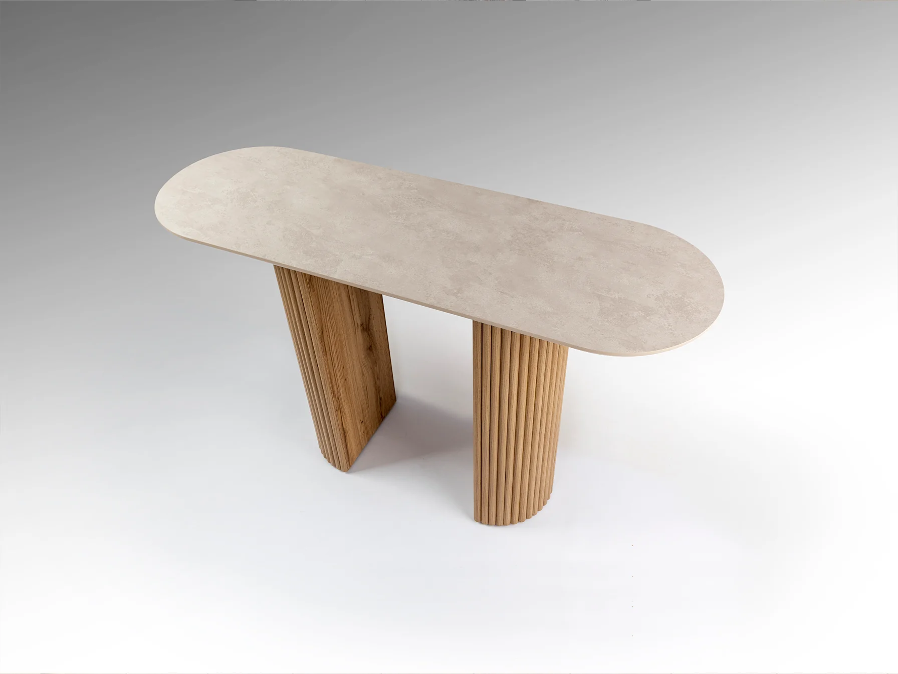 Schuller, sinónimo de calidad premium y diseño exigente, ha creado la consola Irati utilizando materiales de primera calidad. La estructura, fabricada en MDF, garantiza robustez y durabilidad. Las patas, con su superficie acanalada y acabado en madera, aportan un toque rústico moderno que contrasta elegantemente con la tapa. La superficie melamínica de alta resistencia, con acabado piedra mate y cantos a juego, no solo es visualmente atractiva, sino también resistente a los arañazos y fácil de limpiar. La combinación de estos materiales crea una pieza única que resistirá el paso del tiempo.