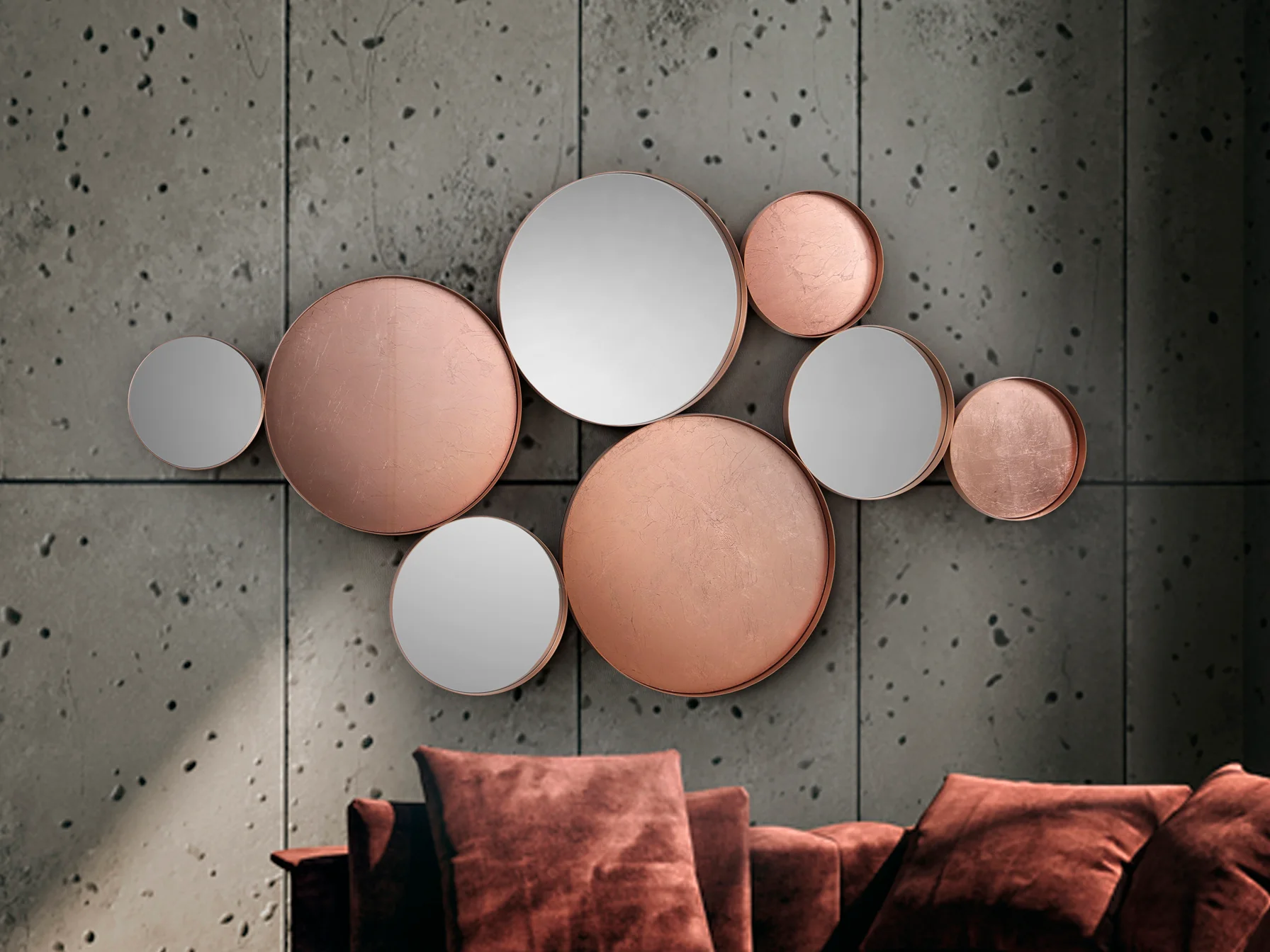 Schuller, sinónimo de calidad premium y diseño exigente, ha creado el espejo Malmo con una atención meticulosa a los detalles. La estructura de metal, con su acabado en oro rosa envejecido, ofrece una robustez y durabilidad excepcionales, mientras que los discos de espejo y cristal con fondo en pan de oro rosa aportan un brillo cálido y acogedor. El metal, frío al tacto, contrasta elegantemente con la calidez visual del oro rosa, creando una pieza que es tanto moderna como atemporal. Este espejo no solo refleja tu imagen, sino también tu buen gusto.