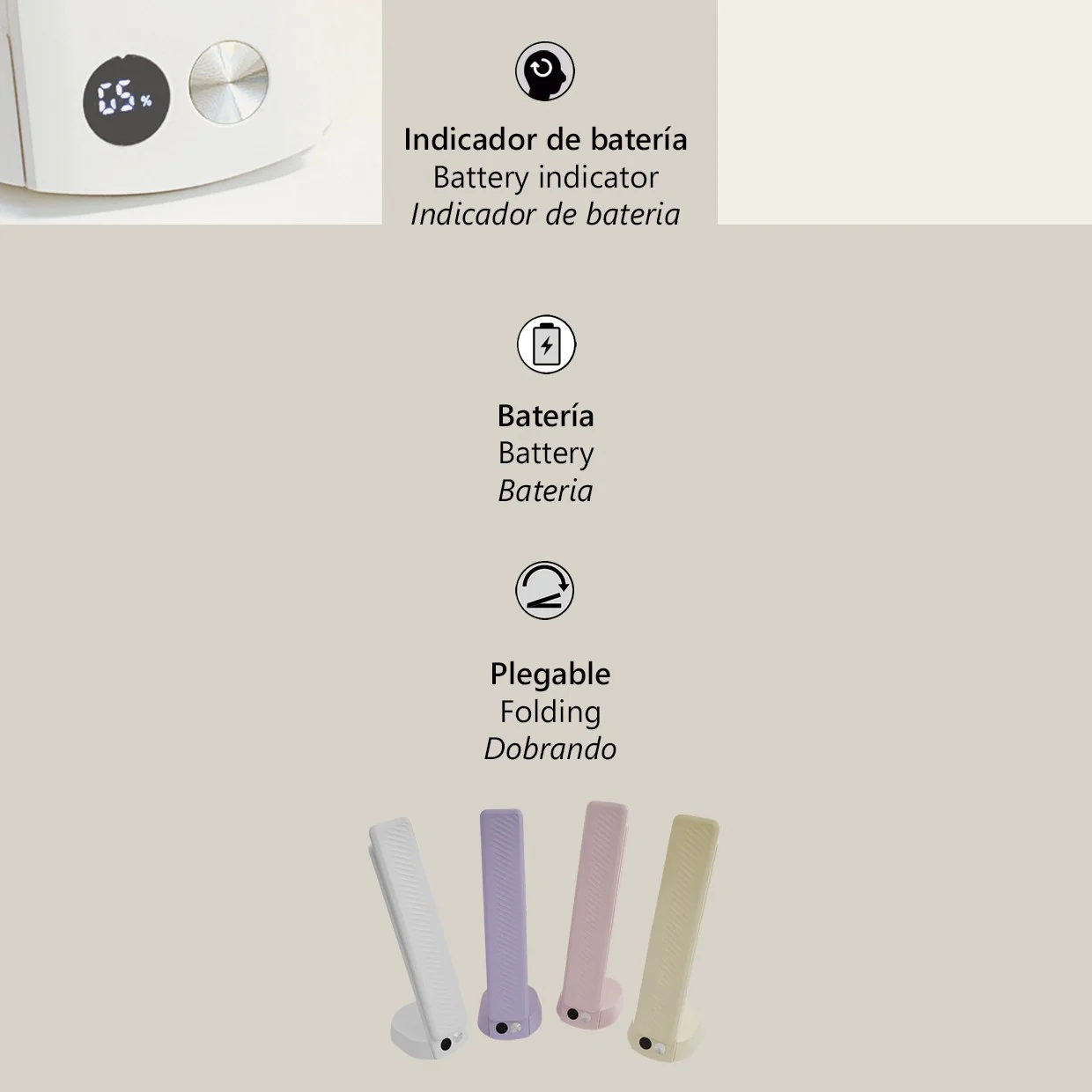 Imagina trabajar en un corte de luz o leer en la cama: el Blum se pliega fácilmente, se carga vía USB y su pantalla LCD te avisa del nivel de batería para que nunca te quedes a oscuras.