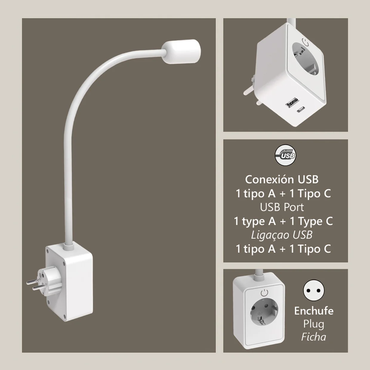 Los puertos USB y Tipo C soportan la mayoría de smartphones, tablets y accesorios estándar; la toma de enchufe adicional cubre electrodomésticos básicos, haciendo este flexo multifunción y versátil.