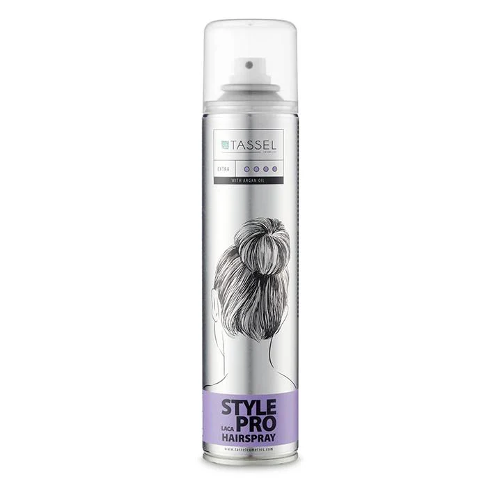 Laca de fijación extra fuerte Tassel Style Pro 300 ml ideal para recogidos o peinados que requieren una fijación alta que dure todo el día. Fórmula con aceite de Argán que deja el pelo con un brillo natural protegiéndolo de la humedad durante todo el día. Ligero aroma a Vainilla y Melocotón.