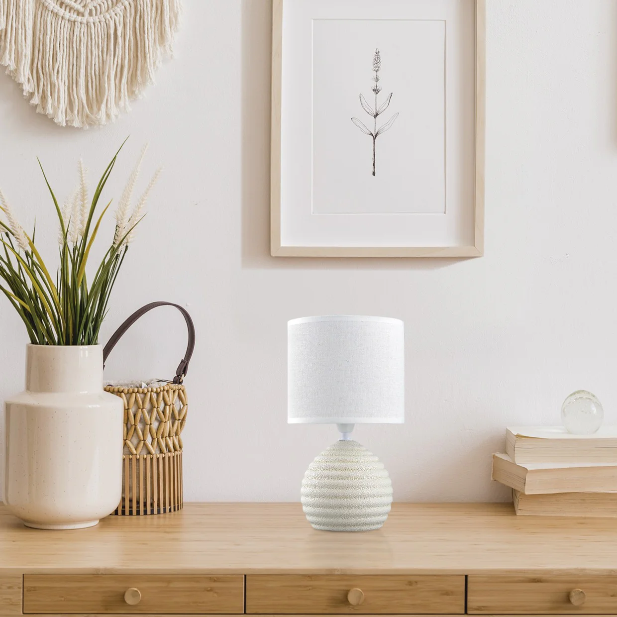 Esta lámpara combina materiales duraderos con un diseño funcional que se adapta a cualquier estilo interior. Su base en cerámica beige proporciona estabilidad, mientras que la pantalla de tela blanca asegura una difusión óptima de la luz, evitando sombras duras y promoviendo un ambiente sereno. Compatible con LED, reduce tu factura energética sin sacrificar la estética.