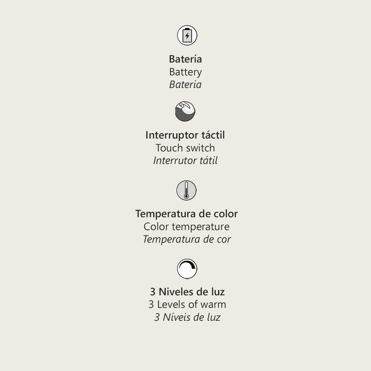 - Interruptor táctil superior: Accede fácilmente a tres niveles de luz, facilitando ajustes rápidos sin botones complicados.