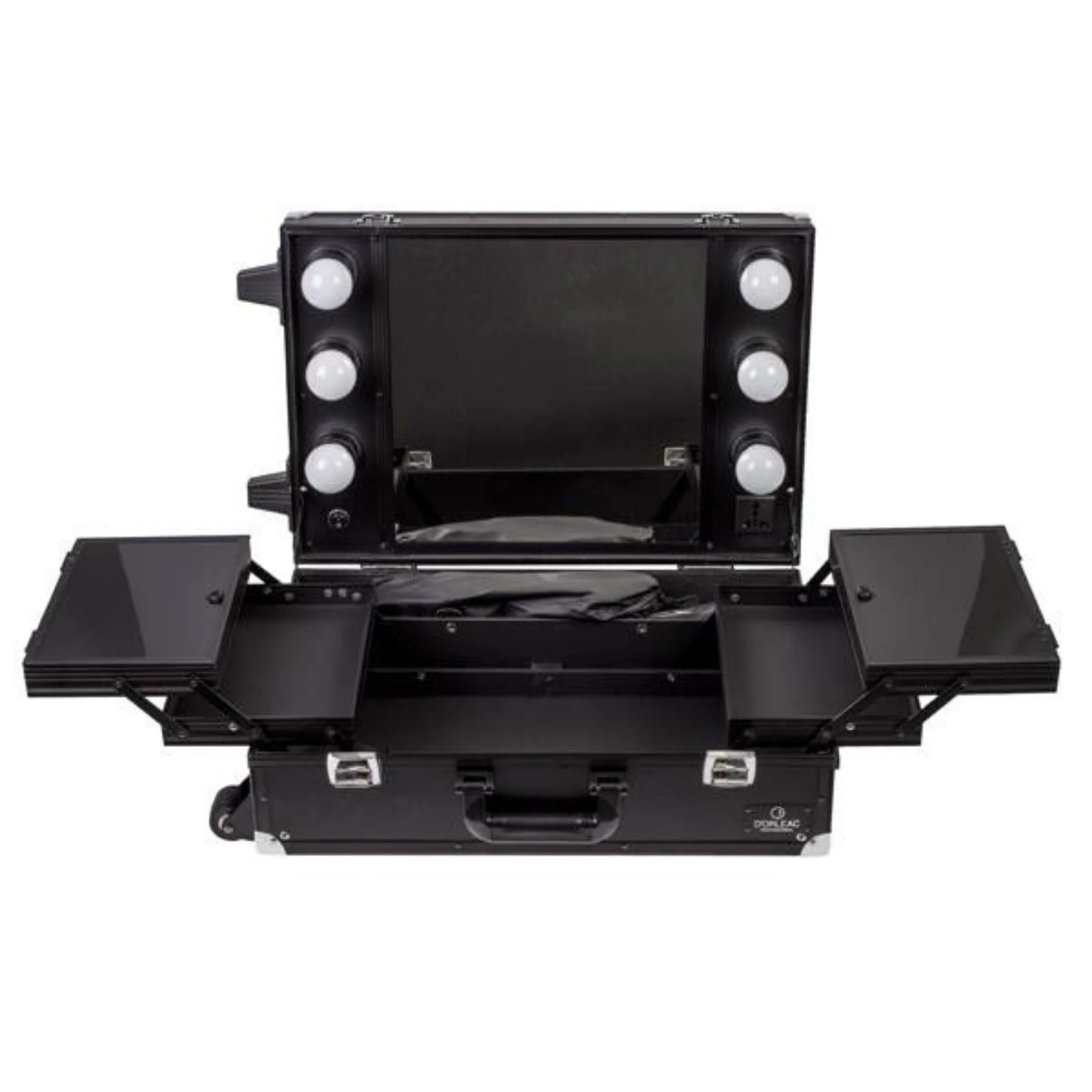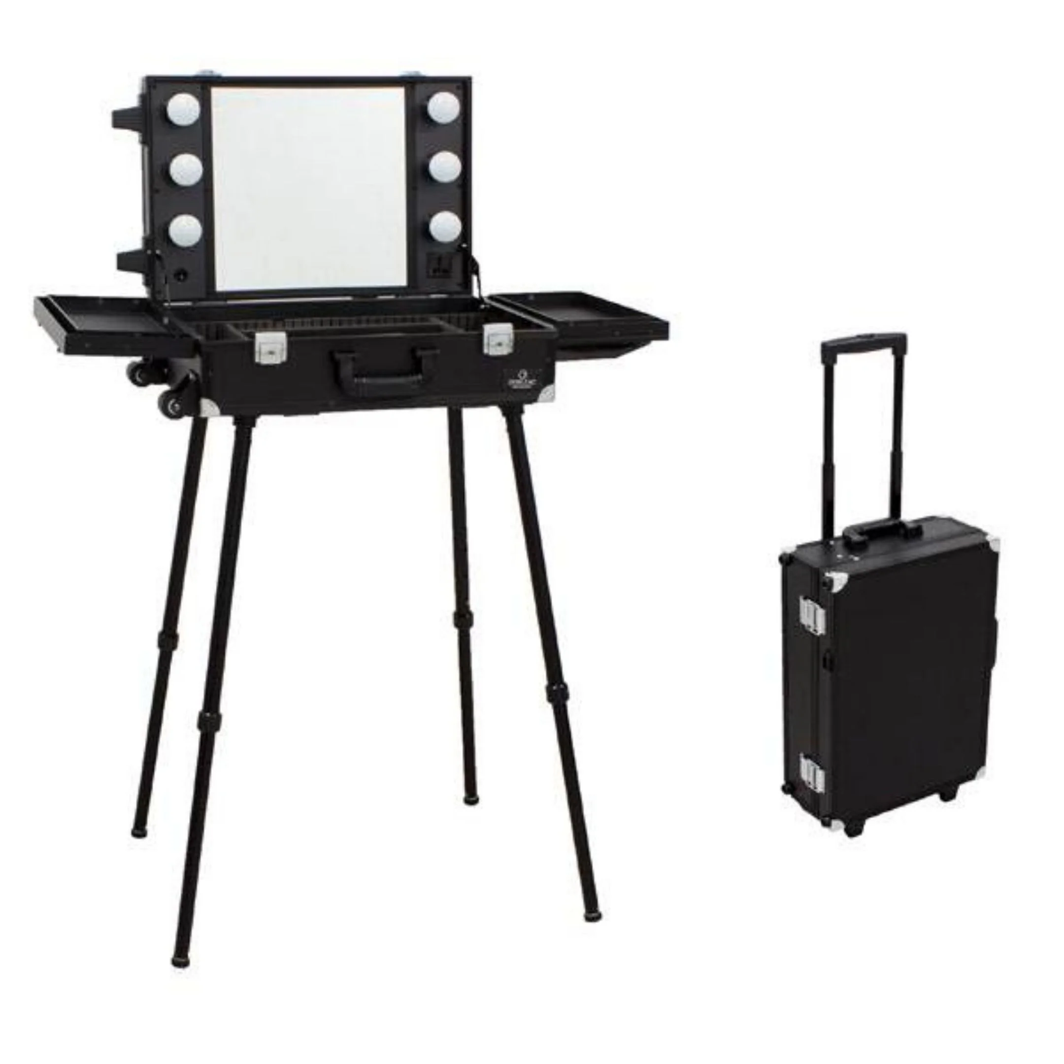 Maletín Tocador de maquillaje con patas y luces que puedes llevar a donde tú quieras. Es un accesorio ideal para los profesionales que hacen trabajos a domicilio como bodas, comuniones u otros eventos. Un maletín donde puedes llevar todos tus productos de maquillaje de una forma cómoda y segura. Solo tendrás que buscar un sitio, conectarlo para disfrutar de luz, sacar las patas y a maquillar como en tu Centro de Belleza.