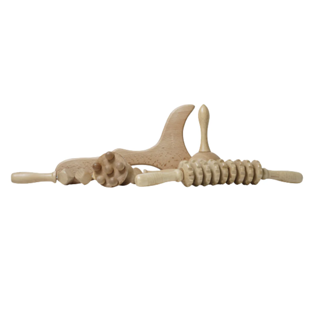 Pack para el completo tratamiento de Maderoterapia mediante masajes en el que se usan instrumentos diseñados para el bienestar emocional y corporal que favorecen la circulación sanguínea, ayudan a reducir la celulitis, a eliminar el exceso de grasa localizada, la retención de líquidos y a tonificar el cuerpo.