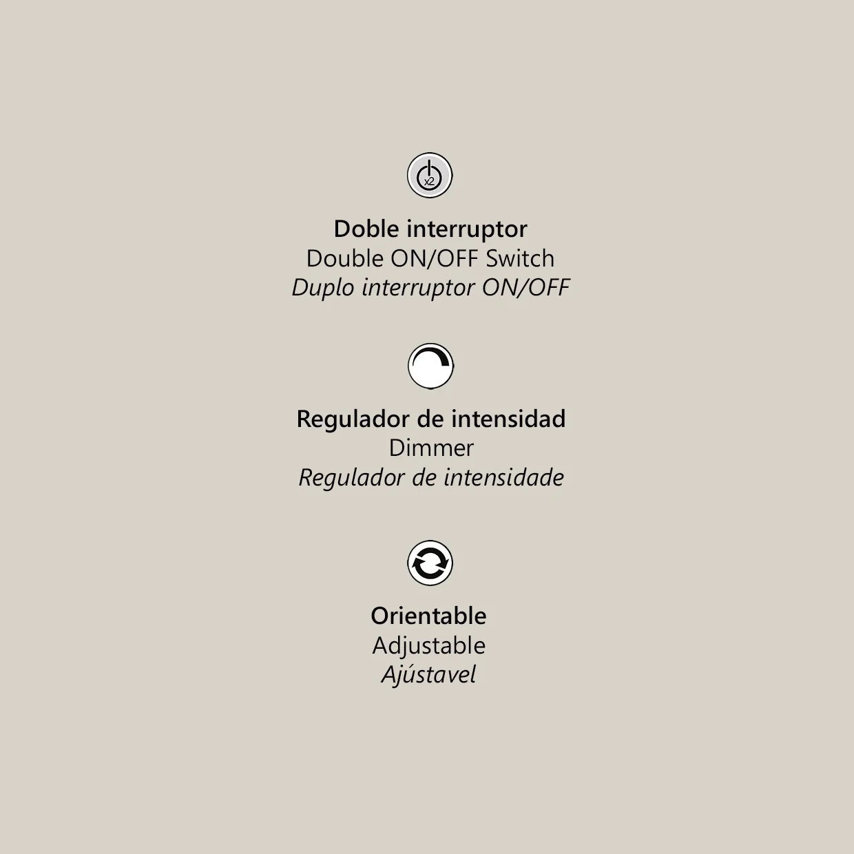 Usa el doble interruptor ON/OFF en la barra para dimerizar tanto la luz principal como el lector, permitiendo ajustes precisos sin necesidad de mandos adicionales. Es intuitivo y responde al tacto inmediato.
