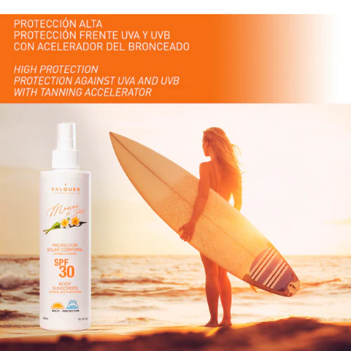 Protector solar corporal SPF 30 protege e hidrata 300ml de protección alta y resistente al agua. Protección frente a la radiación UVA y UVB y frente a la acción de radicales libres. Contiene Tirosina, Riboflavina y Aminoácidos que activan e intensifican el bronceado porque favorece la síntesis de la melanina. Fórmula rica en aceites que hidratan la piel.