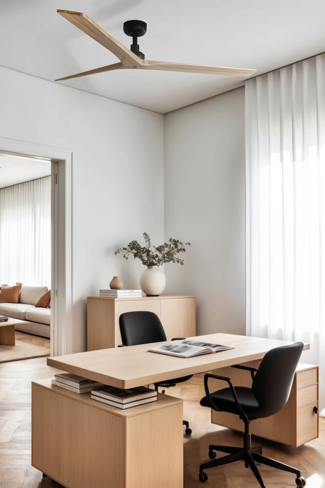- 3 Palas de Madera Reversibles: Generan una brisa natural suave con función inversa para recirculación de aire caliente, ideal para todo el año sin esfuerzo.