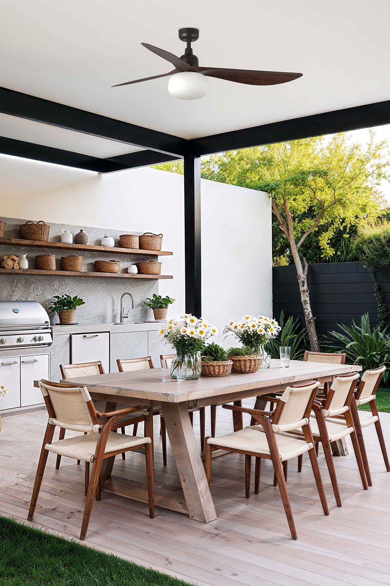 Perfecto para propietarios de hogares con terrazas o patios que buscan ventilación y luz duradera en exteriores, o para hostelería en áreas abiertas como restaurantes al aire libre. Ideal para climas cálidos donde necesitas refrescar espacios sin comprometer el estilo, con mando a distancia para control fácil desde cualquier punto.