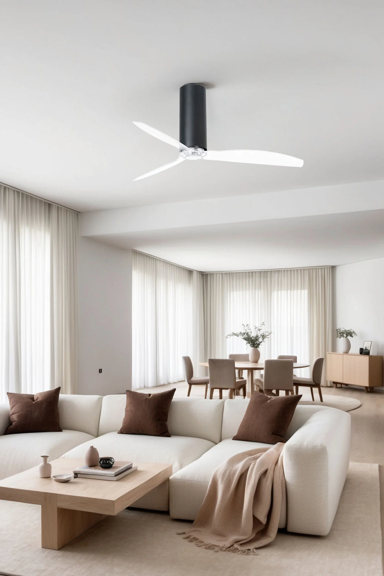 - Diseño Ligero y Compacto (1.28m Diámetro): Fácil de instalar en techos estándar, con palas de PC transparente para una estética moderna que se integra en cualquier decoración.