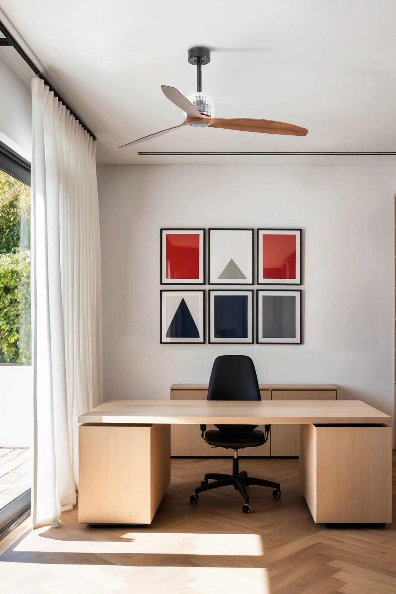 Ideal para familias que buscan ventilación eficiente en salones o dormitorios durante el verano, o para oficinas donde se necesita circulación de aire silenciosa y ahorradora. Perfecto para entusiastas del diseño que desean un ventilador sin luz que integre estilo natural de nogal en espacios modernos, resolviendo problemas de calor sin elevar la factura eléctrica.