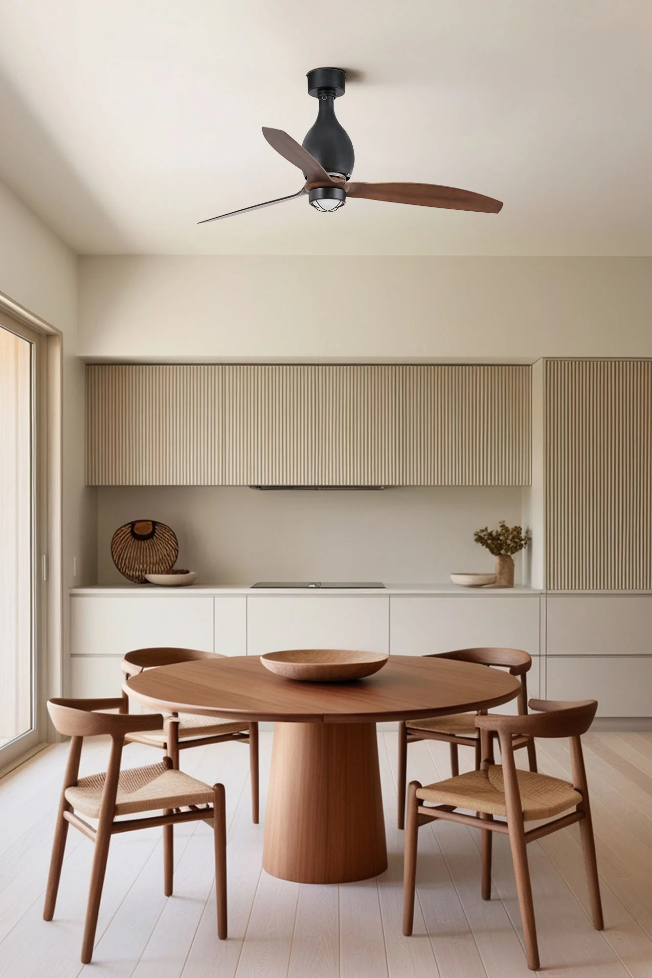 - Diseño compacto de 1280 mm diámetro: Con palas reversibles en ABS y acabado en nogal, se adapta a techos estándar, proporcionando ventilación invernal y un estilo minimalista que eleva la estética de tu hogar.