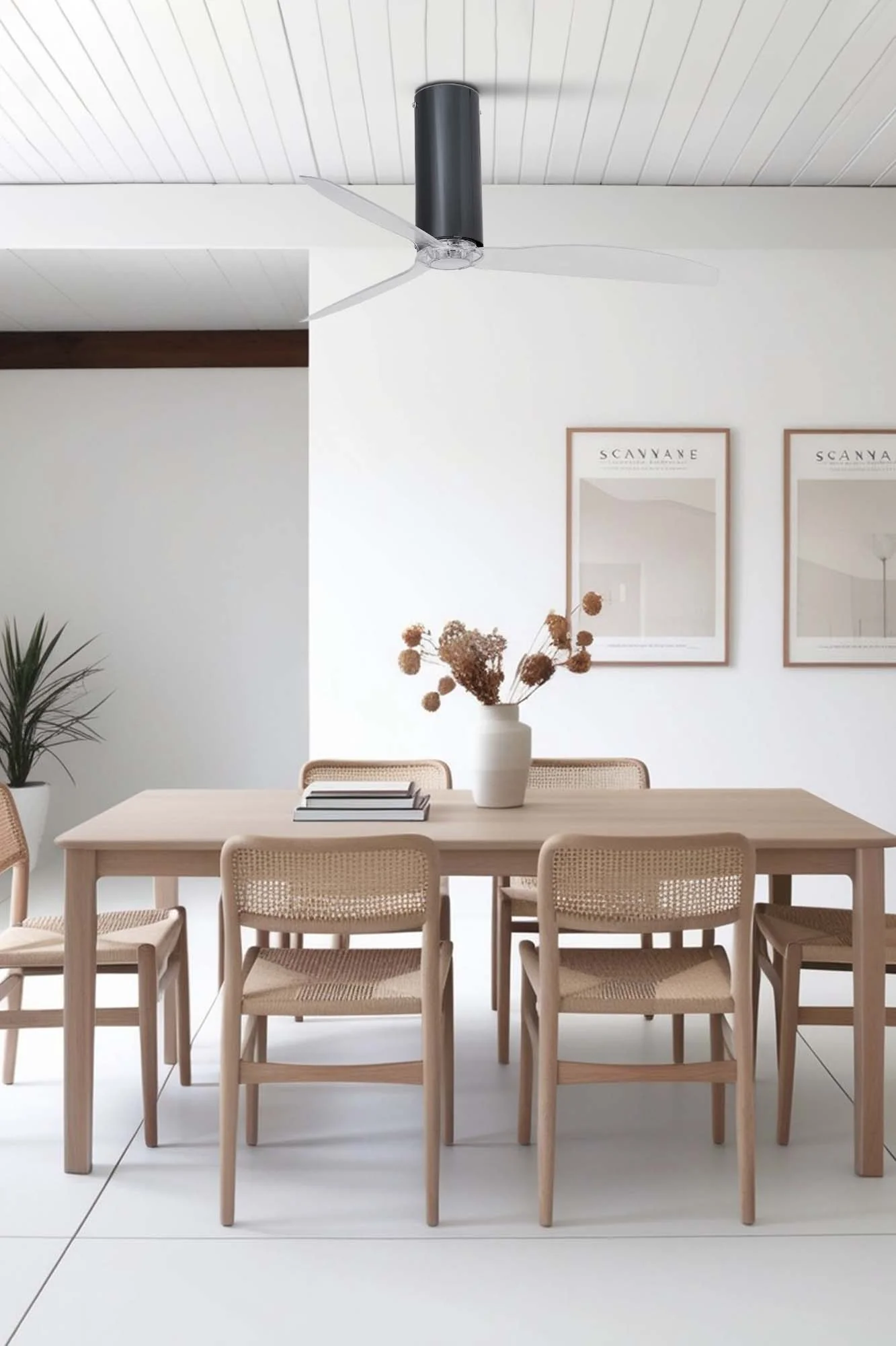 - Diseño Tubular de 128 cm de Diámetro: Con 3 palas de PC transparente y cuerpo en acero negro brillo, integra perfectamente en techos modernos, proporcionando cobertura amplia sin comprometer la estética.