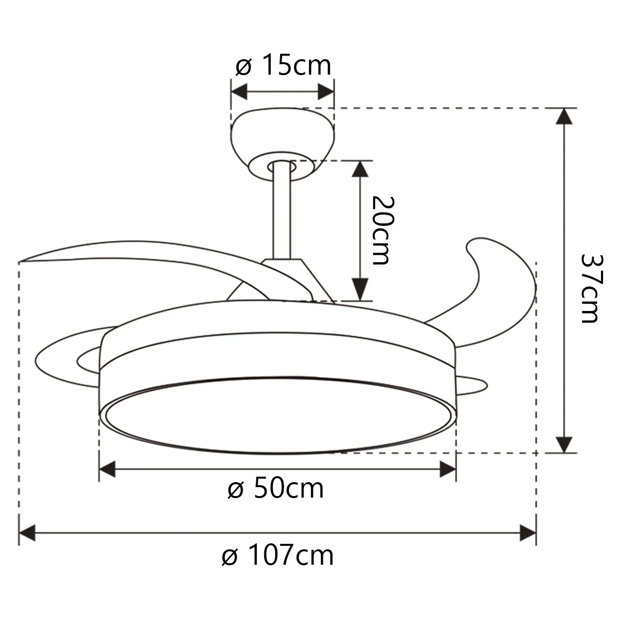 - Diámetro de 50cm (palas cerradas), 107cm (palas abiertas)
