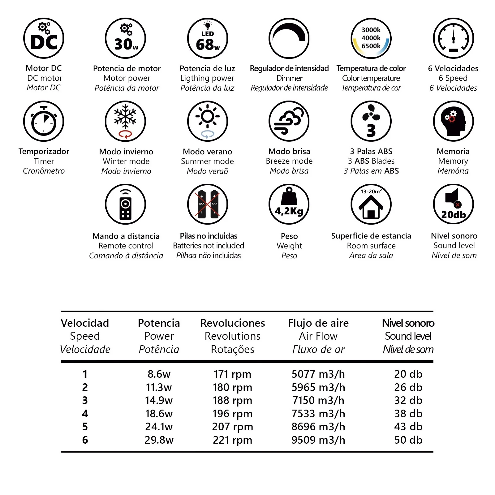 | Funciones | 6 Velocidades, Modo Invierno, Modo Verano, Modo Brisa, Temporizador, Memoria |